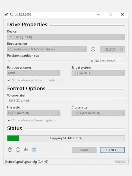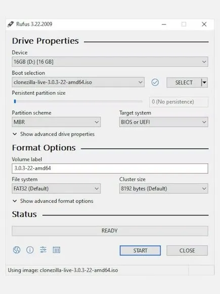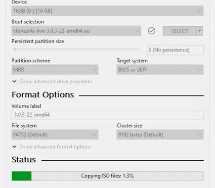 1. اپلیکیشن Clonezilla را دانلود و روی یک فلش یا CD رایت کنید. میتوانید فرایند رایت کردن روی فلش یا CD را از طریق اپلیکیشنی مثل Rufus انجام دهید. این اپلیکیشن میتواند یک USB قابل بوت شدن ایجاد کند.
