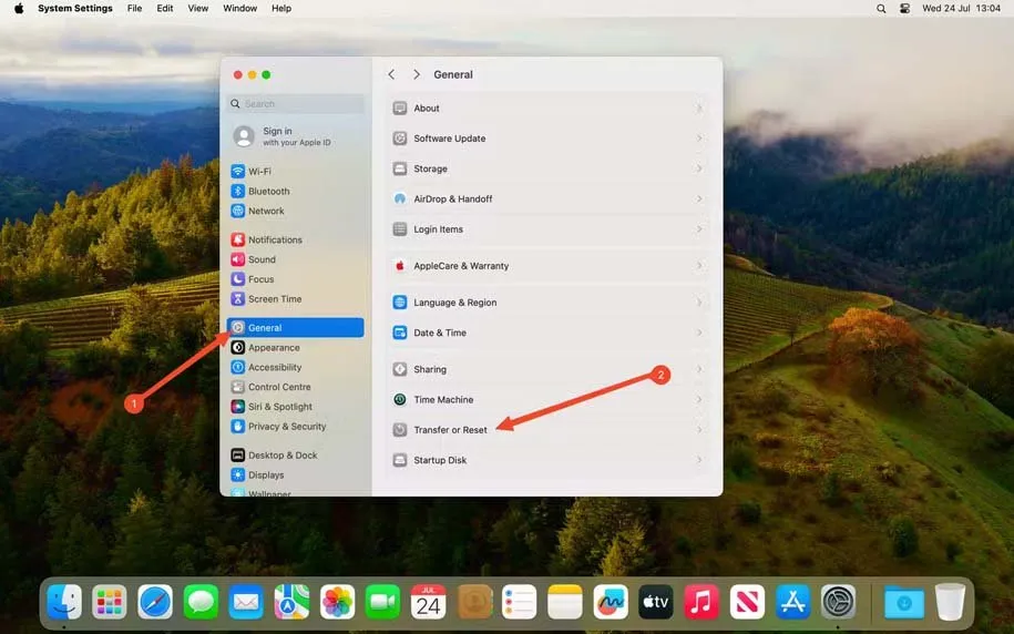 روش یافتن Erase Assistant کمی بسته به نسخه سیستمعامل شما متفاوت است. برای macOS Ventura، Sonoma، و Sequoia، روی آیکون Apple در نوار منو در گوشه بالا-چپ صفحه کلیک کنید، “System Settings” را انتخاب کنید و سپس به General > Transfer or Reset بروید.