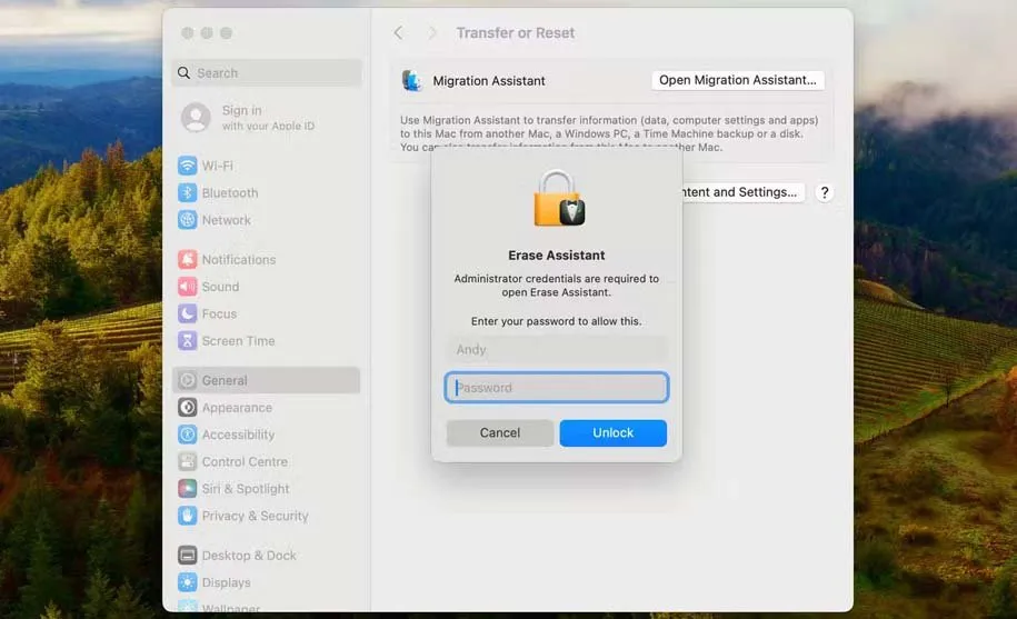 گزینه “Erase All Content and Settings” را انتخاب کنید. پس از درخواست، رمز عبور خود را وارد کنید تا Erase Assistant اجرا شود.