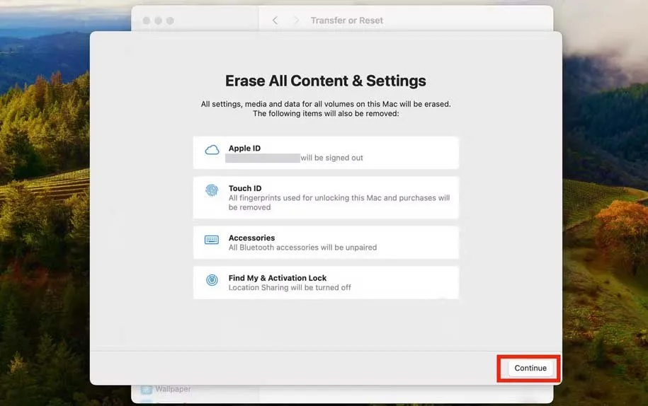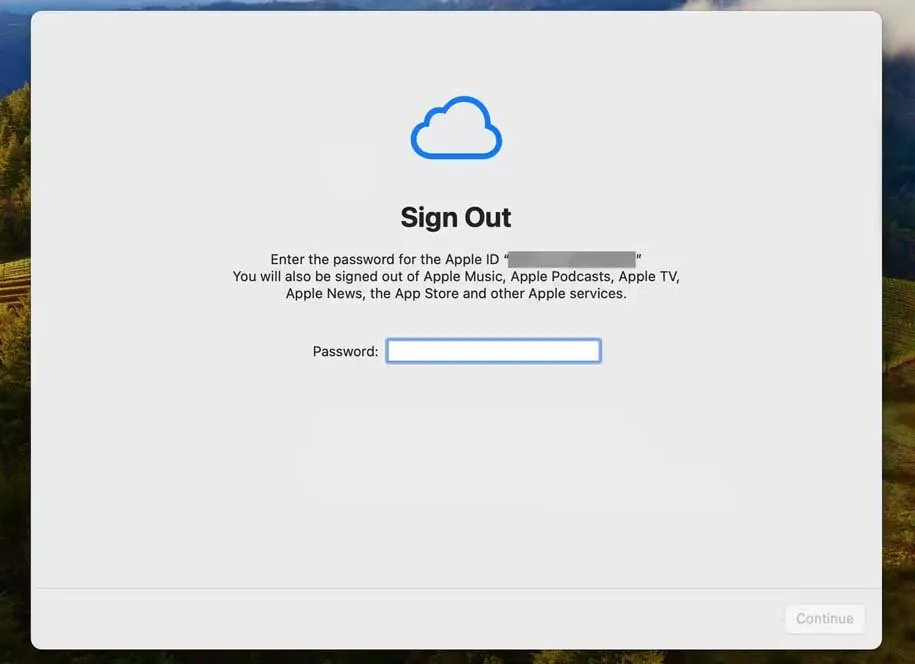 اگر مایل به ادامه هستید، روی “Continue” کلیک کنید. به دلایل امنیتی، از شما خواسته میشود که رمز عبور Apple ID خود را وارد کنید که با این کار از سیستم خارج خواهید شد.