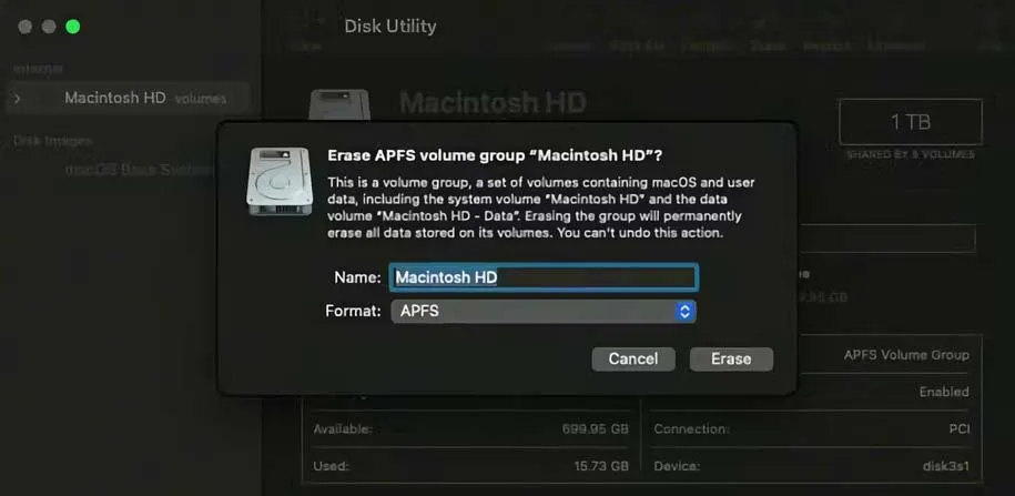 پس از انجام این مراحل، باید وارد Recovery Mode شوید. مک خود را خاموش کنید (Apple Menu > Shut Down)، سپس آن را دوباره روشن کنید و هنگامی که لوگوی اپل را روی صفحه دیدید، دکمههای Command+R را فشار دهید. در صورت نیاز، رمز عبور Administrator را وارد کنید، سپس روی “Disk Utility” در منوی ظاهر شده کلیک کنید. در Disk Utility، “Macintosh HD” را از نوار کناری انتخاب کنید. اطمینان حاصل کنید که پشتیبانگیری کردهاید، سپس روی “Erase” در نوار ابزار کلیک کنید. با این کار، تمامی دادههای موجود در درایو حذف خواهد شد.