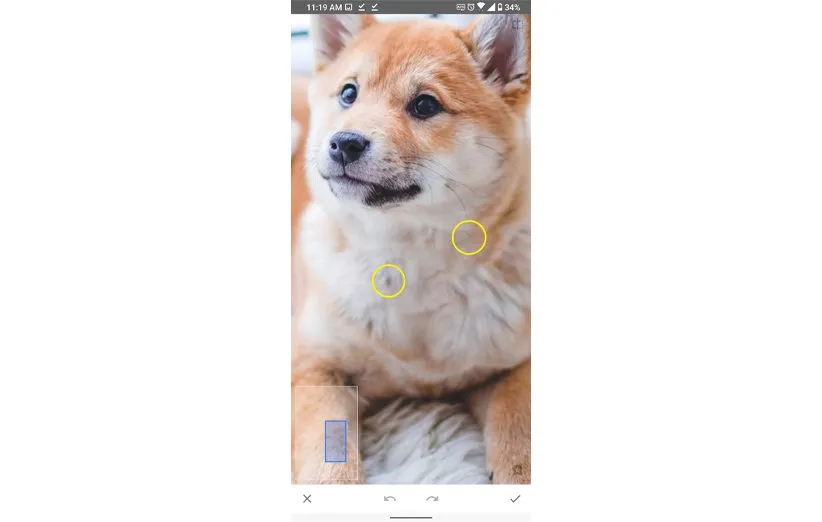 در بین گزینههای زیر، یک علامت X وجود دارد که آنچه انجام دادهاید را خنثی میکند. دو علامت ↶ و ↷ بهعنوان بازگشت به حرکت قبل و بعد عمل میکنند. شما بعد از اینکه محل دلخواه را انتخاب کردید، کافی است گزینهی سمت راست یعنی علامت ✓ را انتخاب کنید تا Snapseed آن را پاک کند.