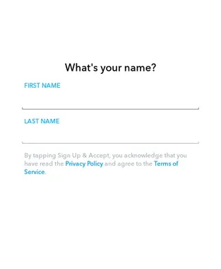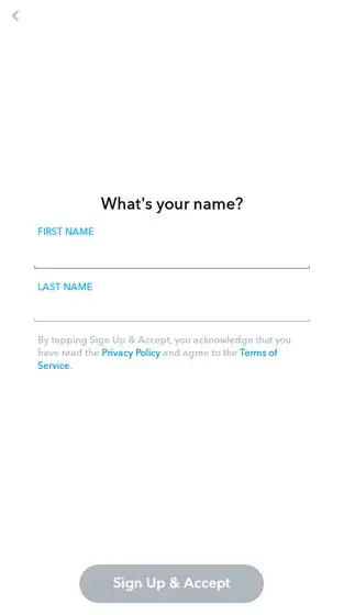 - وارد کردن نام: در صفحهی بعد، نام و نام خانوادگی خود را در کادرهای مشخص شده وارد کرده و روی Sign Up & Accept کلیک کنید. با این کار، شما قوانین و شرایط استفاده از اسنپچت را میپذیرید.
