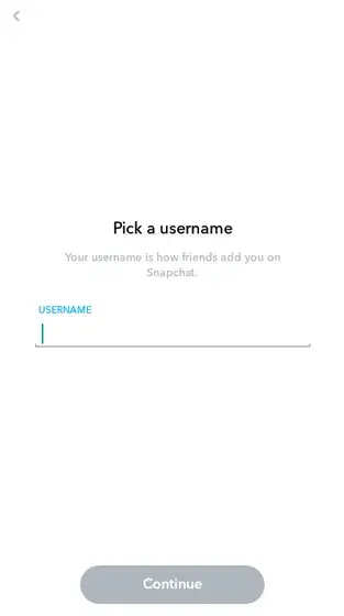- انتخاب نام کاربری: در این مرحله باید یک نام کاربری (Username) یکتا برای خود انتخاب کنید. این نام شناسهی شما در اسنپچت خواهد بود و دیگران از طریق آن شما را پیدا میکنند. اگر نام کاربری انتخابی شما قبلا استفاده شده باشد، برنامه به شما گزینههایی را پیشنهاد میدهد.