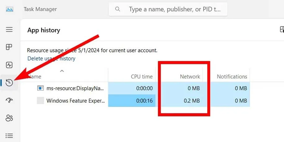 در Task Manager، بر روی تب “App History” در منوی سمت چپ کلیک کنید. در سمت راست، آمار مصرف برنامههای در حال اجرا بر روی کامپیوتر خود را مشاهده خواهید کرد. به ستون “Network” توجه کنید تا ببینید هر برنامه چه مقدار داده (بر حسب مگابایت) مصرف میکند.