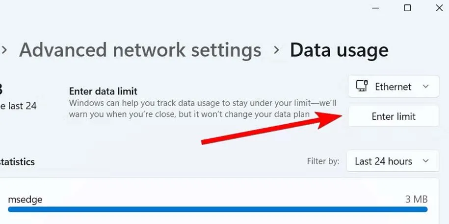 در همین صفحه، همچنین میتوانید آمار مصرف دادهی برنامهها و سرویسهای مختلف را مشاهده کنید. مهمترین قابلیت این بخش، امکان تعیین محدودیت برای مصرف داده است. با کلیک بر روی دکمه «تنظیم محدودیت (Enter Limit)» در بالا سمت راست، میتوانید این کار را انجام دهید.