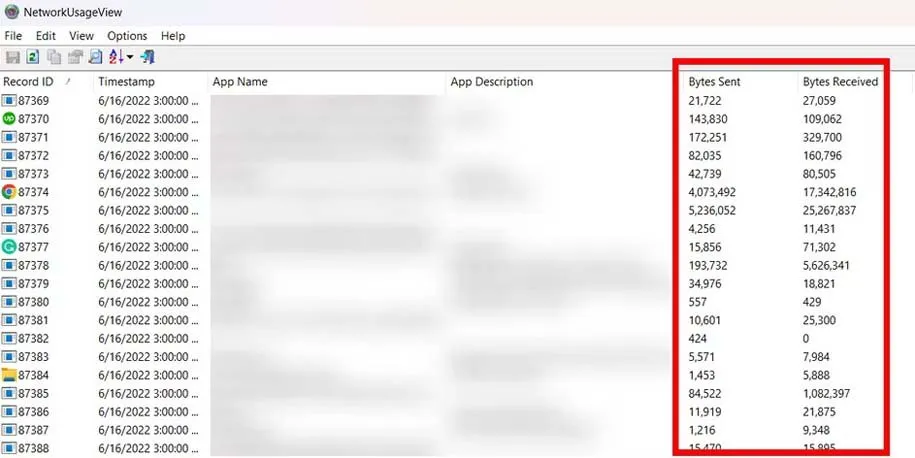 یکی دیگر از برنامههایی که برای بررسی مصرف اینترنت در ویندوز 11 میتوانید استفاده کنید، NetworkUsageView است. این نرمافزار اطلاعات مربوط به مصرف داده را به صورت ساعتی از پایگاه دادهی SRUDB.dat در کامپیوتر ویندوزی شما استخراج میکند. این فایل حاوی اطلاعات مهمی در مورد نحوه استفاده برنامهها، سرویسها و پردازشها از منابع سیستم شما، از جمله منابع شبکه، است.