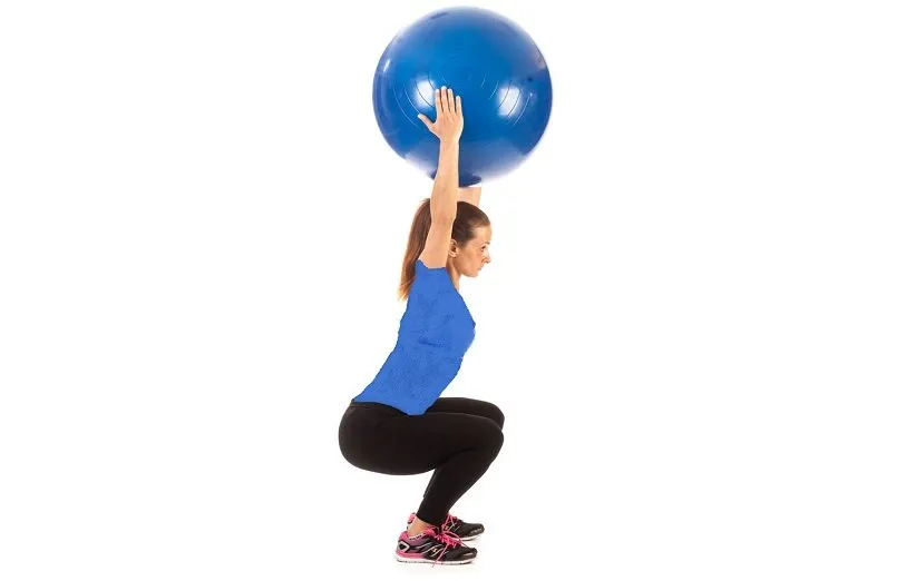 برای انجام این کار کافی است به توپ تناسب اندام تکیه دهید سپس بدن خود را به سمت پایین ببرید تا زانوها زاویهی 90 درجه داشته باشند و رانها هم با زمین موازی شوند. دقت داشته باشید پشت خود را صاف به توپ بچسبانید و بازوها را هم کنار بدنتان آویزان کنید. شما همچنین میتوانید دستان خود را در یکدیگر قفل کنید و جلوی بدن نگه دارید.