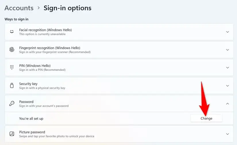 - در بخش Ways to sign in، گزینهی Password را پیدا کرده و روی آن کلیک کنید.