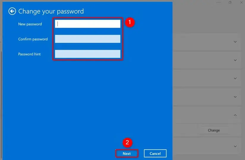 - در پنجرهای که باز میشود، رمز عبور جدید خود را دو بار وارد کرده و یک عبارت راهنما برای آن تعیین کنید.