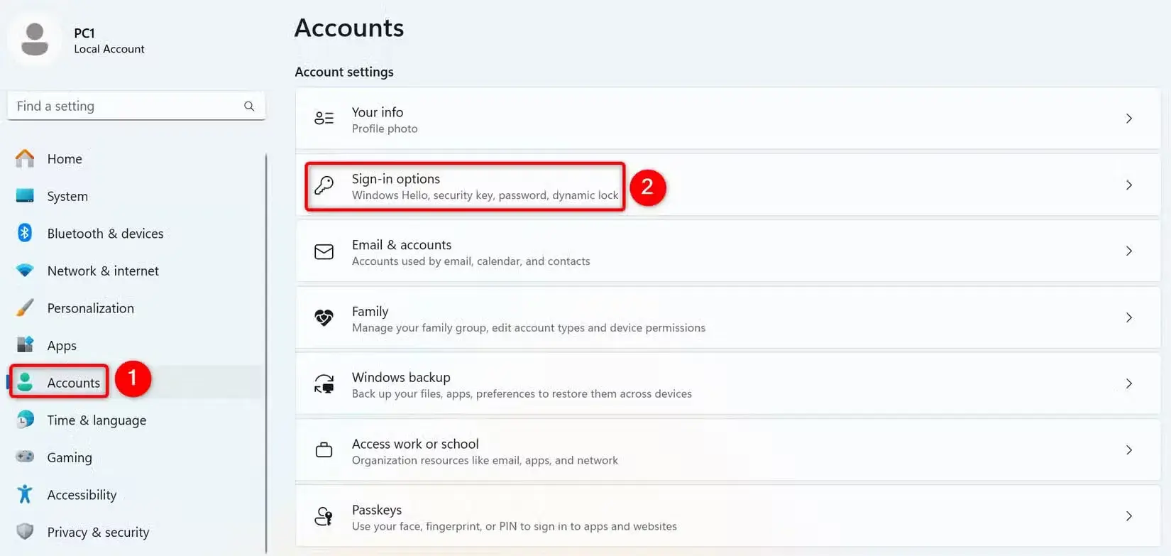 - از منوی سمت چپ، روی Sign-in options کلیک کنید.