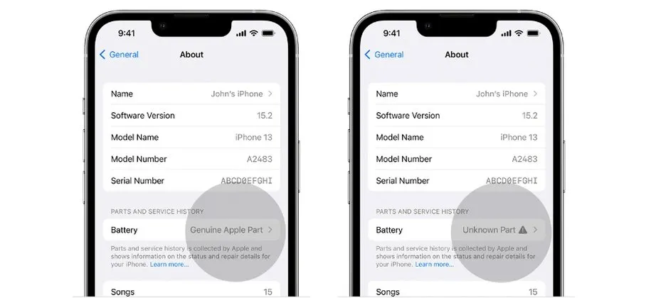 علاوه بر اینها، یکی از روشهای تشخیص باتری اصلی آیفون، وارد شدن به تنظیمات، قسمت General و سپس About است. در اینجا اگر گوشی شما از قبل تعمیر شده باشد، یک بخش به نمایش تحت عنوان Parts and service history هم به نمایش در میآید که اگر عبارت Genuine Apple Part به نمایش در بیاید، یعنی باتری اصلی است، اگر عبارت