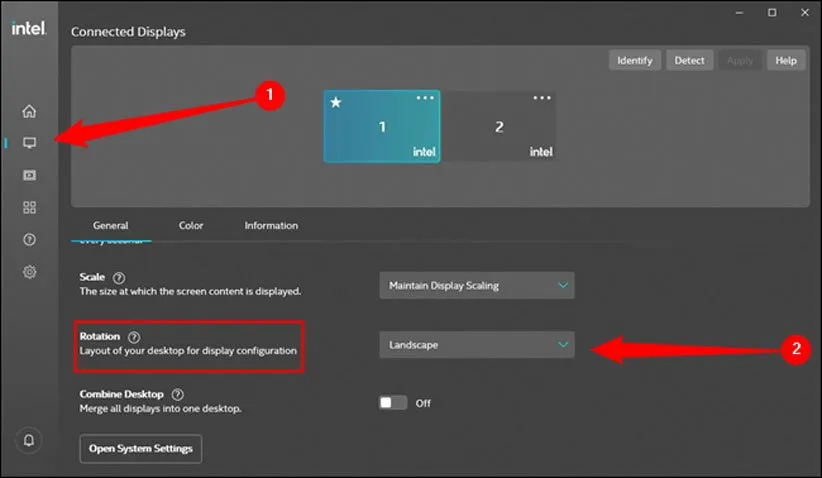 برای اجرای برنامهی Command Center اینتل میتوانید از راههای مختلف چنین کاری را انجام دهید ولی راحتترین روش، کلیک بر آیکن آبی رنگ مربوط به این برنامه در تسکبار است. بعد از باز کردن این برنامه، باید روی آیکن Display (آیکن به شکل مانیتور) کلیک کنید و سپس گزینهی مربوط به Rotation را تغییر دهید.