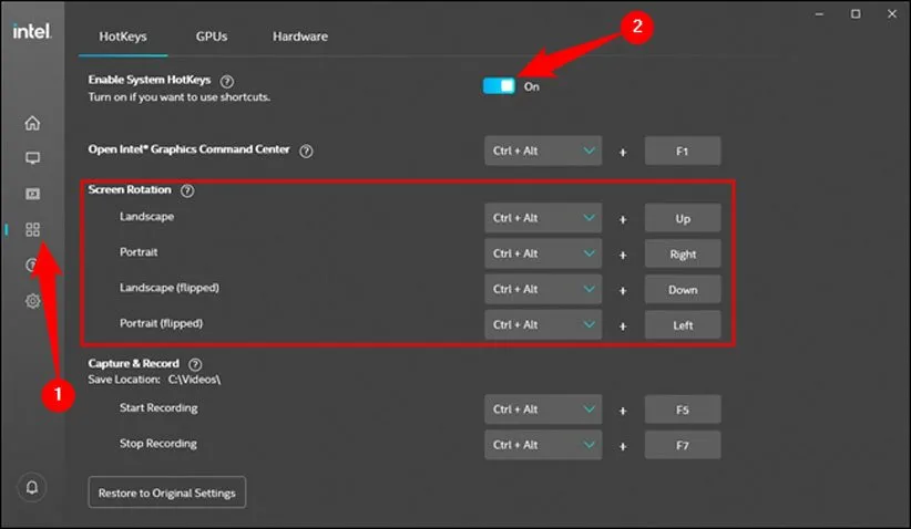 همچنین با این برنامه برای چرخش نمایشگر میتوانید میانبر هم تعریف کنید. برای این کار مطابق با تصویر زیر روی آیکن موردنظر کلیک کنید و سپس گزینهی Enable System Hotkeys را فعال کنید. در بخش Screen Rotation هم قادر به تعیین میانبرهای مختلف برای جهتهای گوناگون نمایشگر هستید.