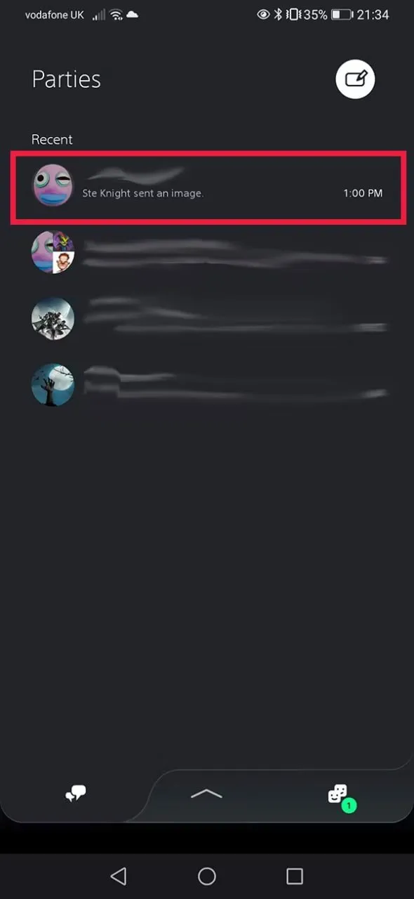 حال پس از ارسال فایلتان باید به برنامهٔ پلیاستیشن بر روی گوشی خود بروید. در بخش بالا سمت چپ صفحهٔ اصلی شما آیکون Parties را میتوانید پیدا کنید. بر روی آن کلیک کرده تا منوی Parties باز شود. در اینجا چتی را که اسکرینشات یا ویدئو را به آن ارسال کردید انتخاب کنید. فایلی که از پلیاستیشن فرستادید باید در این چت باشد.