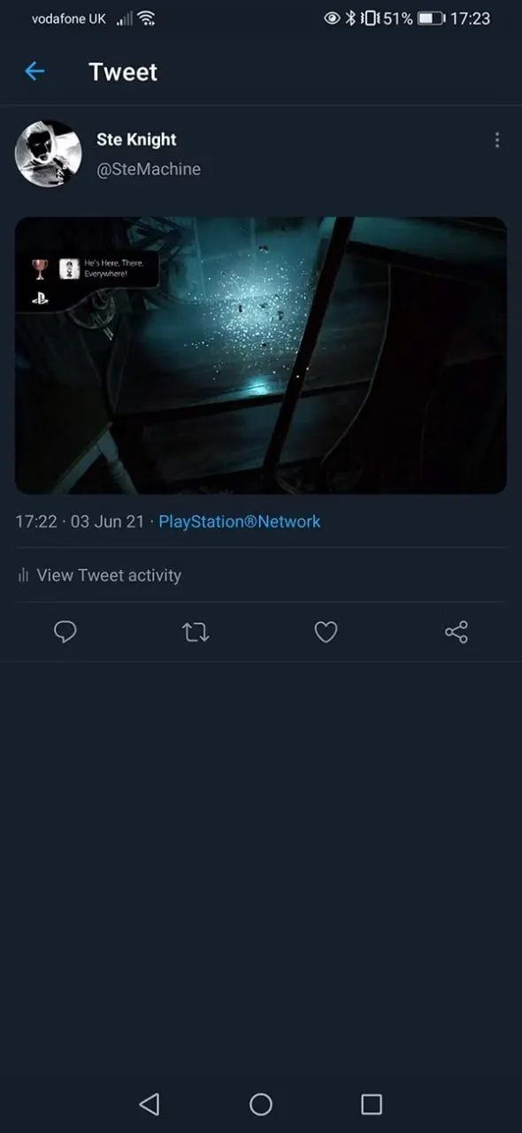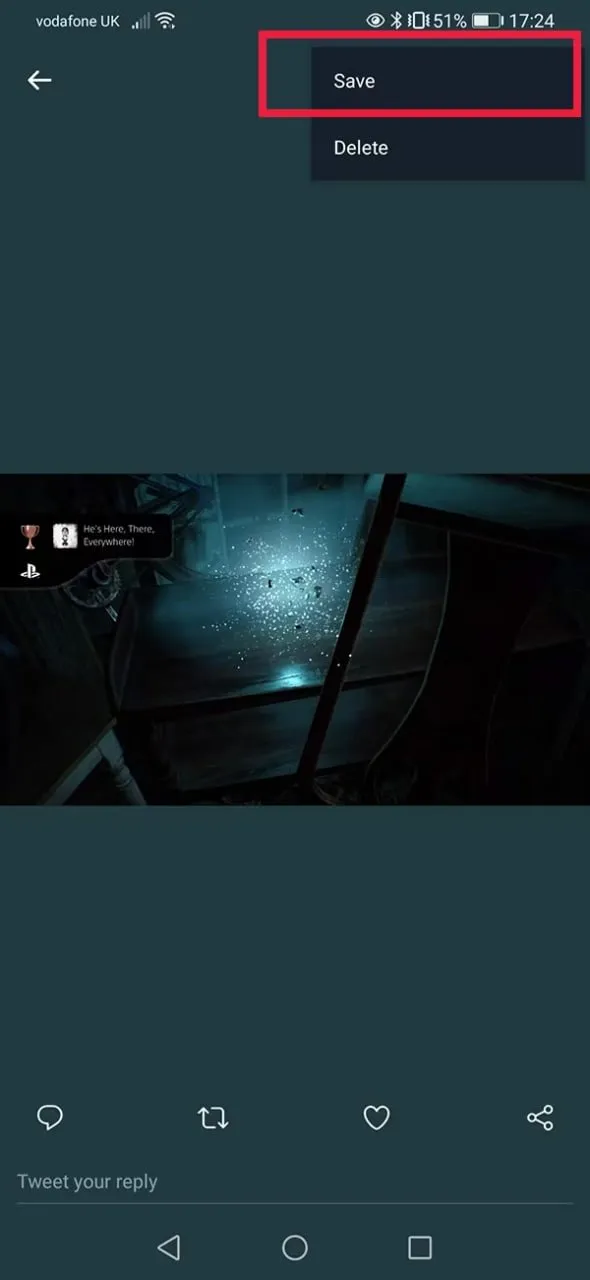 بر روی تلفن همراهتان ابتدا برنامه توییتر را باز کنید. سپس وارد صفحهٔ پروفایل خود شوید. در آنجا میتوانید فایلی که از پلیاستیشن 5 منتشر کردهاید را بهعنوان آخرین توییت خود ببینید. بر روی فایل کلیک کرده تا آن را باز کنید سپس منوی Options را در قسمت بالای فایل انتخاب کنید. از این بخش میتوانید گزینهٔ Save را انتخاب کنید و فایلتان را بر روی گوشی همراه خود ذخیره کنید. بهخاطر داشته باشید که شما همچنین میتوانید از این متد برای ذخیرهکردن فایل بر روی لپتاپ یا رایانهٔ شخصی خود استفاده کنید.