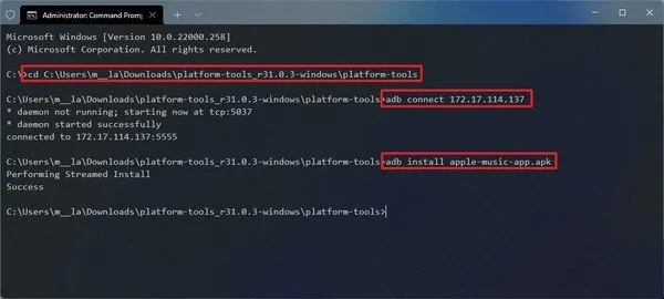 - در اینجا file-name در واقع نام همان فایل apk است که دانلود کرده بودید. مثلا اگر فایل apk شما، apple-music-app.apk نام داشته باشد باید آدرس زیر را در cmd جایگذاری کنید.