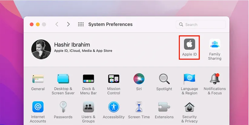 3) روی اپل آیدی در گوشه سمت راست بالا کلیک کنید.
