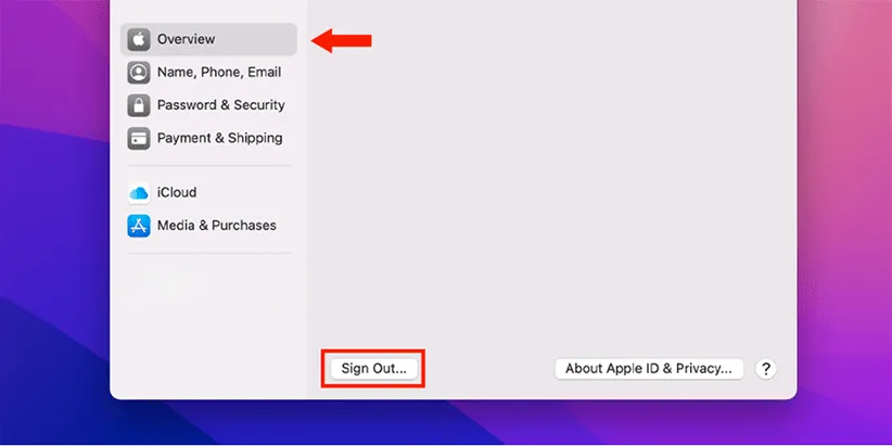 4) Overview را از پنل سمت چپ انتخاب کنید و در پایین روی Sign Out کلیک کنید.