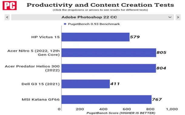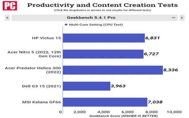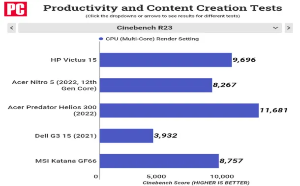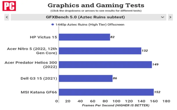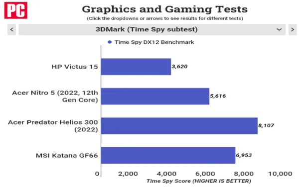 برای تست عملکرد لپتاپ Victus 15، از چند لپتاپ گیمینگ به نسبت مقرون به صرفهی دیگر برای مقایسه استفاده کردهایم. این لپتاپها عبارتند از: MSI Katana GF66، دو مدل لپتاپ ایسر یعنی Nitro 5 و Predator Helios 300 و Dell G3 15. لپتاپ شرکت دِل، ارزانقیمتترین لپتاپ در این لیست محسوب میشود.