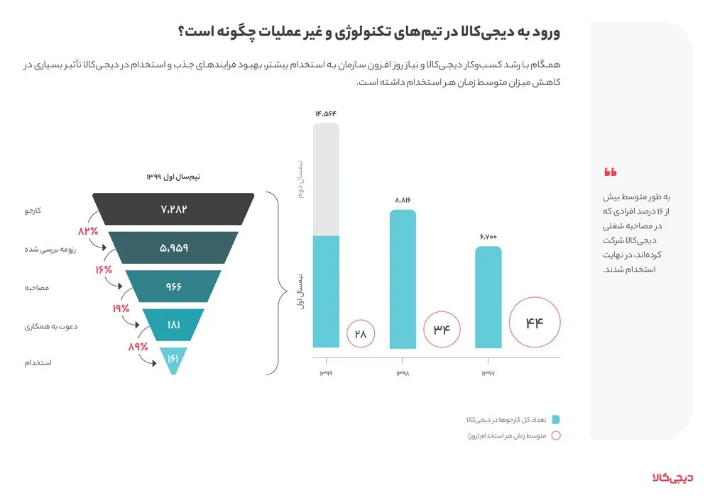 در سال ۱۳۹۷ و ۱۳۹۸ به ترتیب ۶۷۰۰ و ۸۸۱۶ کارجو برای استخدام در واحد تکنولوژی و غیرعملیات دیجیکالا اقدام کردهاند. پیشبینی میشود تا پایان سال بیش از ۱۴ هزار کارجو برای استخدام در این واحدها اقدام کنند. نکته جالب توجه در عملکرد تیم منابع انسانی دیجیکالا، کاهش متوسط زمان هر استخدام با وجود افزایش تعداد کارجوها در سه سال گذشته است. با وجود اینکه از سال ۱۳۹۷ تا ۱۳۹۹ تعداد کل کارجوها رشدی بیش از ۲ برابر داشته، اما فاصله زمانی بین ارسال رزومه تا استخدام در دیجیکالا از ۴۴ روز به ۲۸ روز رسیده که نشاندهنده کاهش ۳۶٪ این زمان است.