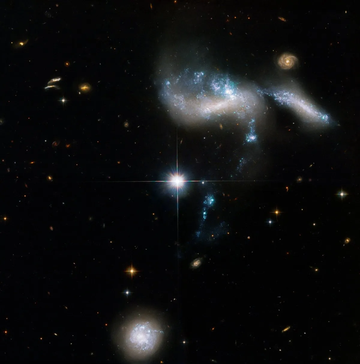 ناسا در توضیح این عکس هابل نوشت: «یک کهکشان کوتوله و سیگاری شکل دیگر در سمت راست (NGC 1741) به رقص آنها با جریان آبی نازک ستارهها میپیوندد که این سه جرم را به هم متصل میکند.» عضو چهارم، HGC 31 هم در پایین سمت چپ قابل مشاهده است. همچنین یک ستارهی درخشان در مسیر کهکشانهای چهارگانه وجود دارد که در مرکز تصویر جای گرفته است.