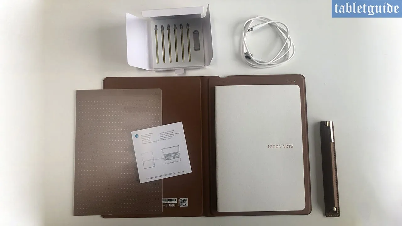 محتویات درون جعبه عبارتند از: کاغذ دیجیتالی Note X10، نسل دوم قلم نوری Scribo هوئیون، 4 سری توپی قلم، 2 سری پلاستیکی قلم، ابزار حذف نوک قلم، آستین قلم مغناطیسی، پنل برای استفاده از این محصول به عنوان یک تبلت گرافیکی، یک کابل USB-C و دفترچه راهنما. در واقع این محصول همهی لوازمی که شما برای شروع طراحی و یادداشتبرداری نیاز دارید را به همراه دارد.