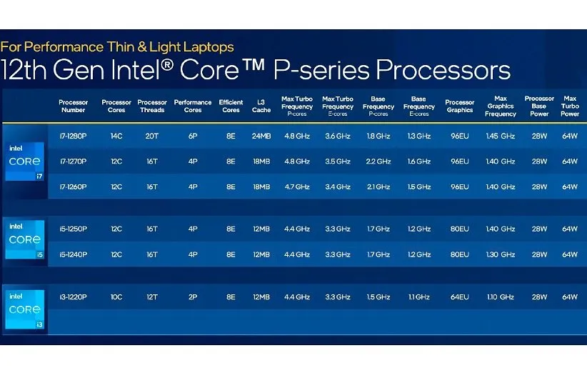اینتل همچنین دربارهی نامگذاری پردازندههای خود تجدید نظر کرده است. برای مثال پردازندههای سری P که توان حرارتی برابر با 28 وات دارند قبلا جزء دستهبندی سری U قرار میگرفتند. تراشههای سری P که قدرت کمتری نسبت به همتایان سری H خود دارند، در بسیاری از جنبهها از جمله تعداد هستهها مشابه هستند. بهعنوان نمونه اینتل Core i7-1280P از 14 هسته شامل 6 هسته قدرتمند و 8 هسته کممصرف بهره میبرد، البته با فرکانس و عملکرد کلی پایینتری روبهرو هستیم.