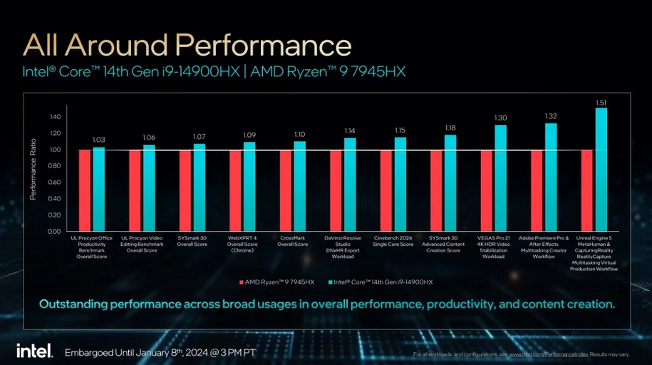 اینتل برای اینکه نشان دهد پردازنده i9 جدیدش چقدر قدرتمند است، به مقایسهی آن با یکی از جذابترین پردازندههای AMD یعنی رایزن 9 7945HX پرداخته که در تصویر بالا میتوانید ببینید چطور در اکثر بازیها این نمایندهی تیم آبی بوده که پیروز و سربلند بوده است. به جز سه بازی نخست، در تمام بازیهای دیگر i9-14900HX توانست بهتر ظاهر شود.