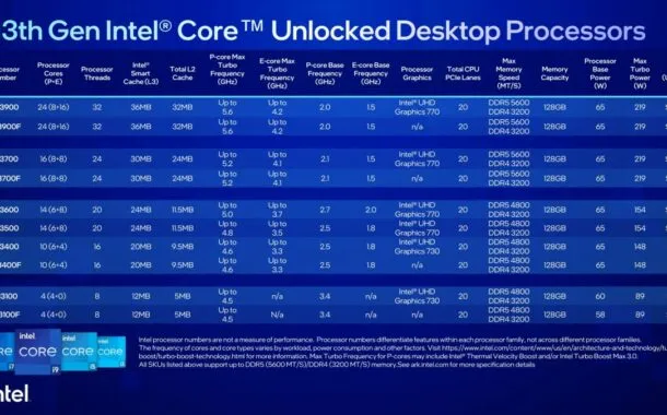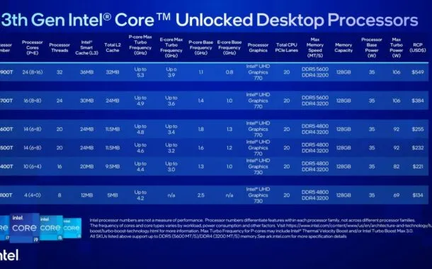 اینتل همچنین از 16 پردازندهی دسکتاپ جدید از نسل 13 رونمایی کرده که ارزانترین مدل آن 109 دلار قیمتگذاری شده است. هیچ یک از این پردازندهها از سری K نیستند و در گرانترین مدل هم قیمت آنها به تقریبا 550 دلار میرسد.