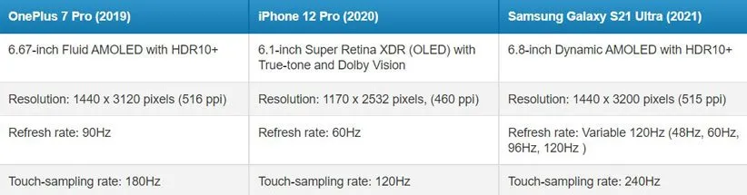 اکنون و پس از ۱۱ سال، بازی تغییر کرده و بعضی از پرچمداران اندرویدی به لطف نرخ رفرش بیشتر و نرخ لمس بالاتر، نمایشگرهای بهتری نسبت به آیفونها دارند. برای درک بهتر موضوع به جدول زیر نگاهی بیاندازید: