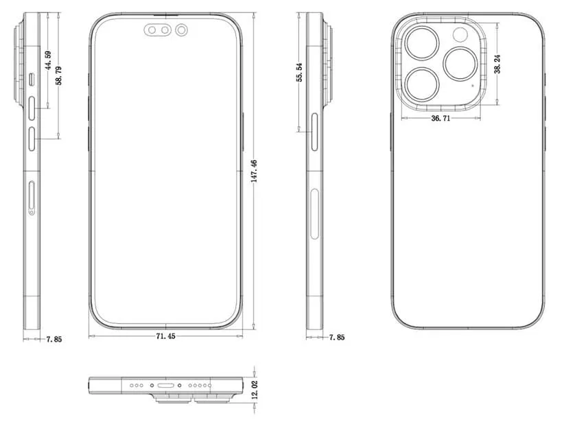 طبق طرحهای شماتیک منتشر شده، ضخامت دوربینهای استفاده شده در آیفون 14 پرو مکس به 4.17 میلیمتر میرسد و طول و عرض ماژول دوربین هم با افزایش 5 درصدی روبرو خواهد شد. همانطور که گفتیم در کنار آیفون 14 پرو مکس، ابعاد دقیق بخشهای مختلف آیفون 14 پرو هم لو رفته است. این گوشی هم از نظر طول و عرض تفاوت چندانی با نسل قبلی ندارد ولی ضخامت ماژول دوربین آن 4.17 میلیمتر است. برای مقایسه باید بگوییم که آیفون 13 پرو از ماژول دوربین مبتنی بر ضخامت 3.60 میلیمتر بهره میبرد.