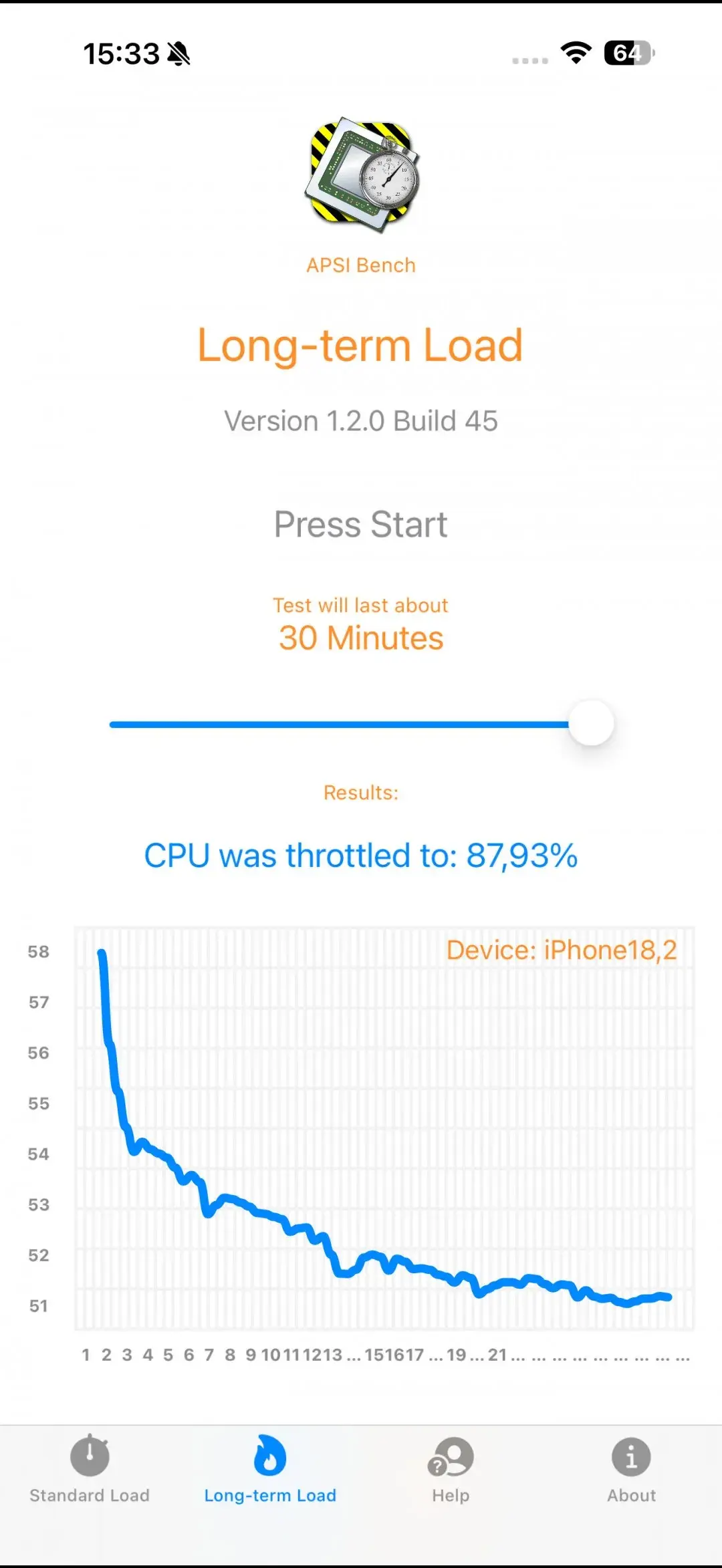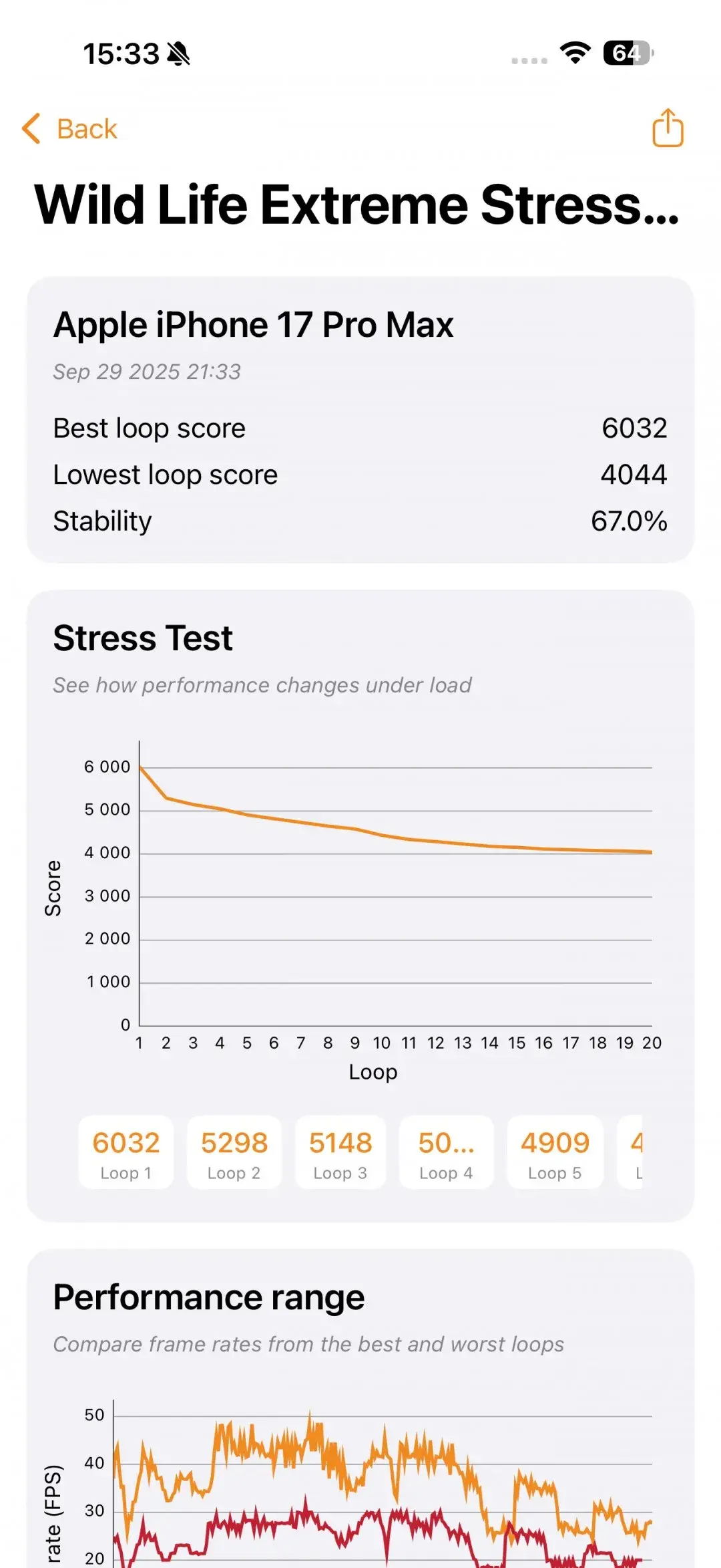 در تستهای پایداری عملکرد، نتایج نشان میدهند که آیفون 17 پرو مکس نسبت به نسل قبل یعنی آیفون 16 پرو مکس بهبود محسوسی داشته است. در تست استرس CPU، این گوشی به 88 درصد پایداری رسید که نتیجهای عالی محسوب میشود. در حالیکه آیفون 16 پرو مکس تنها 77 درصد پایداری داشت.