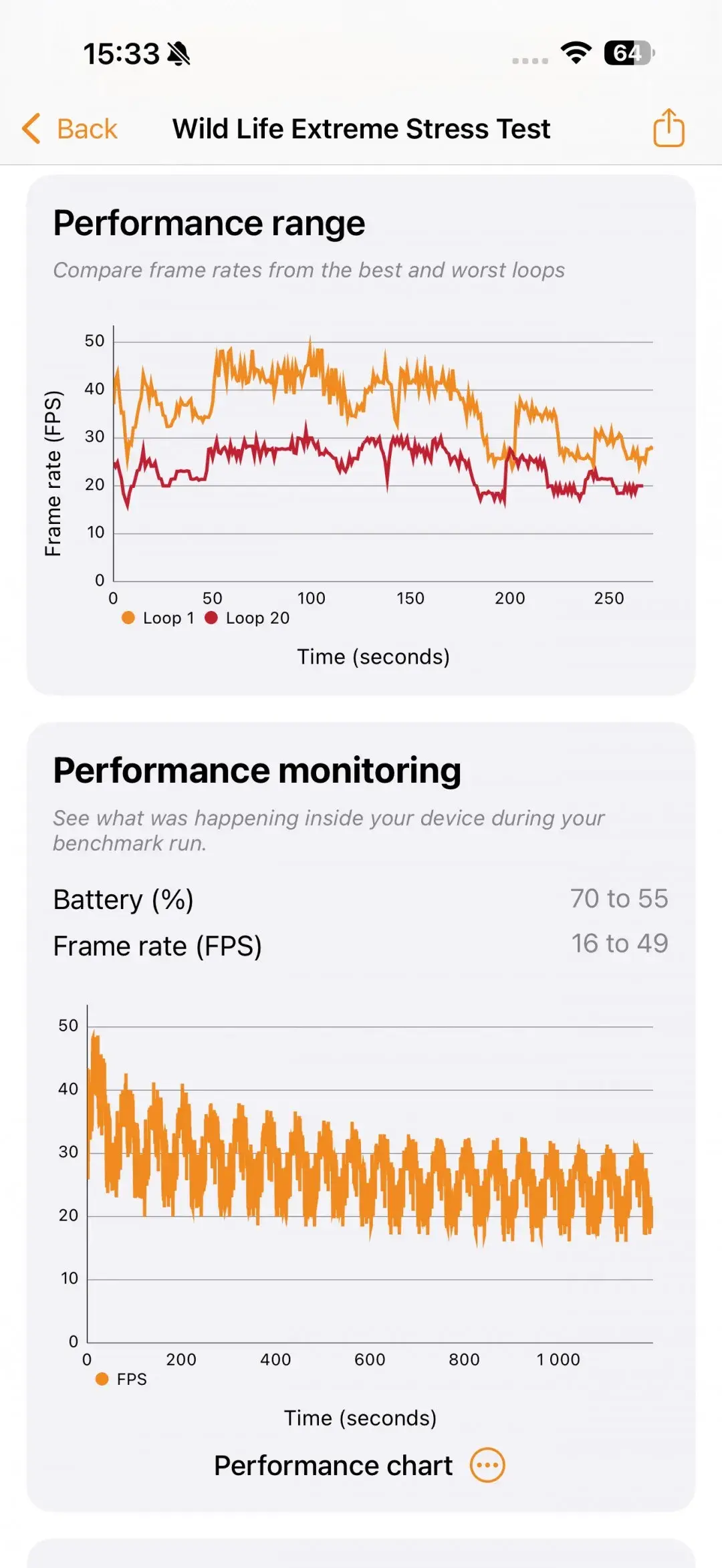در تست گرافیکی 3DMark Wild Life Stress نیز پایداری 67 درصد ثبت شد، کمی بالاتر از نسل قبل با 65 درصد. در مجموع، عملکرد پایدارتر، خنکتر و سریعتر از گذشته است، اما هنوز با وعدهی 40 درصد بهبود اپل فاصله دارد.