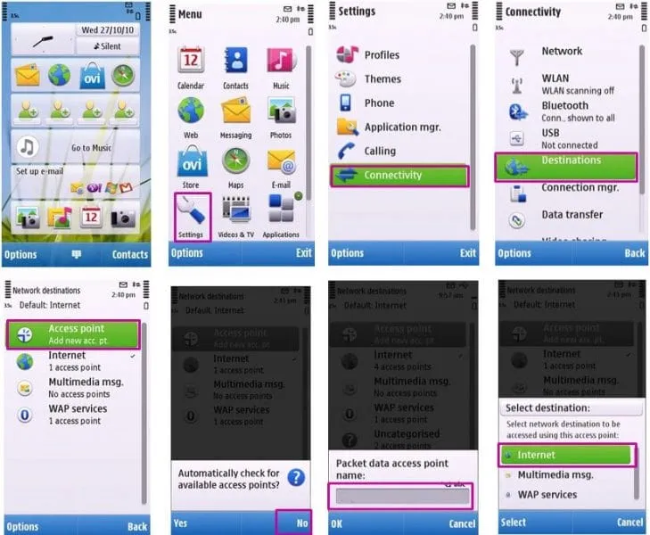 برای گوشیهای سیمبیان که عمدتاً در دستگاههای نوکیا یافت میشوند، برای تنظیمات اینترنت ایرانسل باید مسیر زیر را دنبال کنید؛