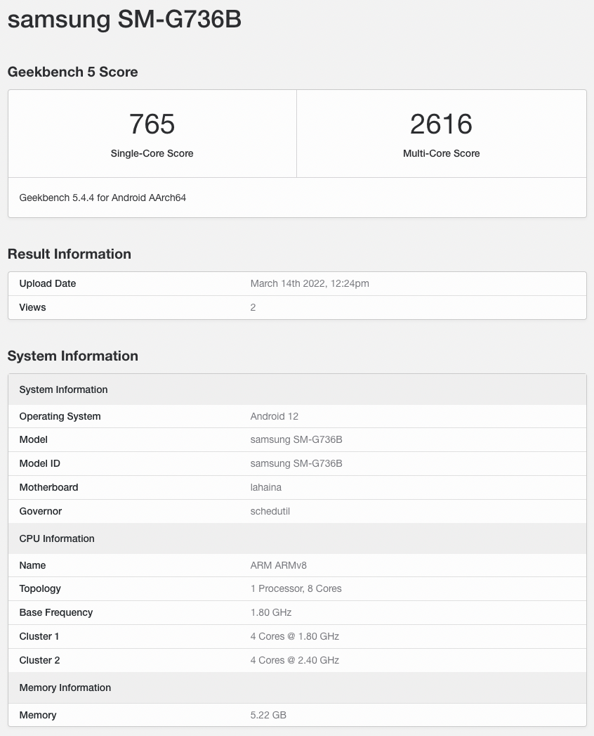 امسال اما اوضاع فرق میکند. اینطور که به نظر میرسد، جانشین گلکسی X Cover پرو که پرو 2 نام خواهد گرفت، با مشخصات فنی بسیار عالی راهی بازار میشود. بهتازگی یک گوشی جدید و البته رونمایی نشده که اطلاع دقیقی هم از زمان رونمایی و عرضهی آن نداریم، با شماره مدل M-G736B در پایگاه دادهی گیکبنچ دیده شد که میتواند همان گلکسی X Cover پرو 2 باشد. محصول جدید از اندروید 12 به عنوان سیستمعامل پیشفرض خود بهره میبرد و رابط کاربری آن هم به احتمال فراوان، One UI 4.1 خواهد بود. برای این گوشی 6 گیگابایت رم و به احتمالا 128 گیگابایت حافظهی داخلی به عنوان ترکیب سختافزاری مدل پایه در نظر گرفته خواهد شد تا بدین ترتیب گوشی عملکرد خوبی در مولتی تسکینگ هم داشته باشد.