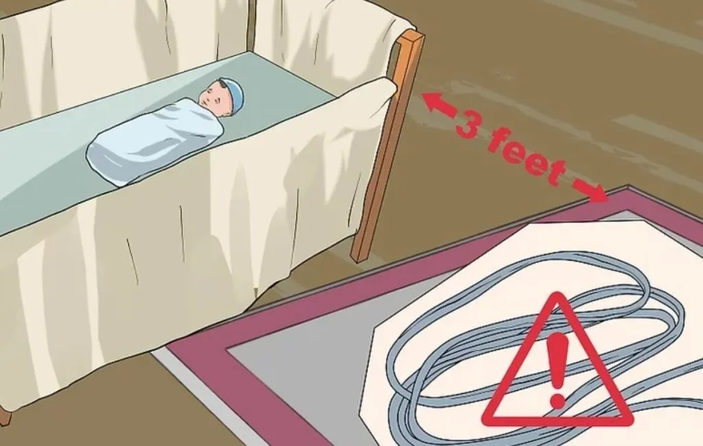 تخت نوزاد را از وسایل برقی، لامپ، مانیتور کودک، چراغ خواب و هر وسیلهای که سیم دارد دور نگه دارید. در صورت نیاز به استفاده از این وسایل در نزدیکی فضای خواب کودک، به خرید گزینههای بیسیم فکر کنید. اگر امکان خرید تجهیزات بیسیم را ندارید حتما بین لوازم و تخت نوزاد حداقل یک متر فاصله ایجاد کنید.