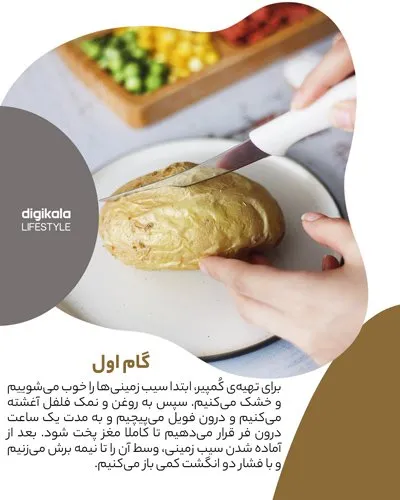 بعد از آماده شدن سیبزمینی، وسط آن را تا نیمه برش میزنیم و با فشار دو انگشت کمی باز میکنیم.