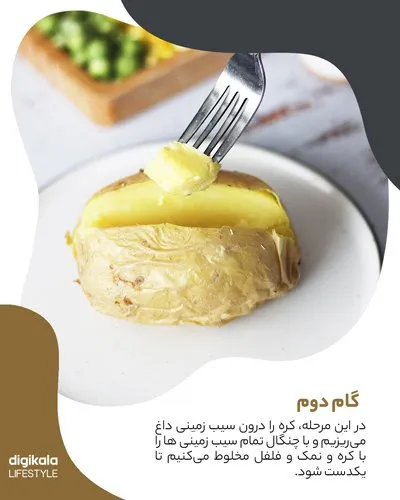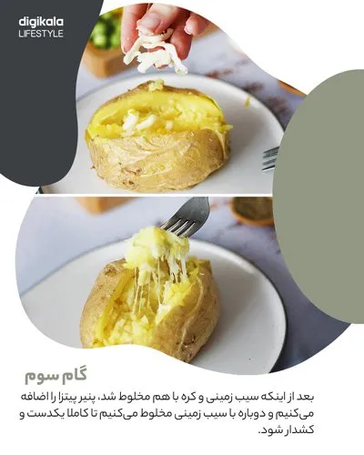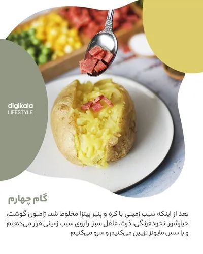 بعد زا اینکه سیبزمینی با کره و پنیر پیتزا مخلوط شد، ژامبون گوشت، خیارشور، نخودفرنگی، ذرت و فلفل سبز را روی سیبزمینی قرار میدهیم و با سس مایونز تزیین و سرو میکنیم.