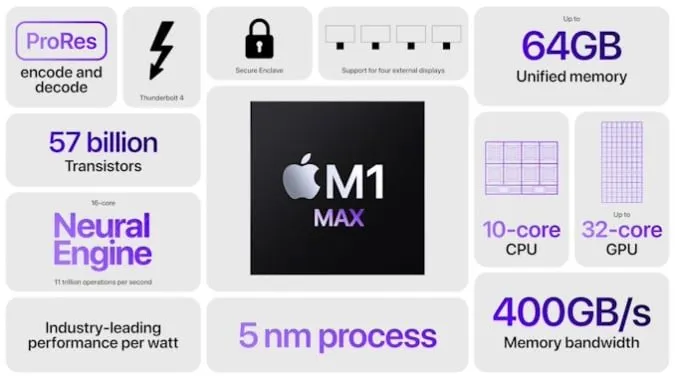اپل همچنین در این مراسم از چیپست قدرتمندتری با نام M1 Max رونمایی کرده که پیکربندی 10 هستهای CPU دارد که شامل 8 هسته قدرتمند و2 هسته کممصرف، 64 گیگابایت حافظهی رم با پهنای باند 400 گیگابایت بر ثانیه و پردازندهی گرافیکی 32 هستهای است. تراشهی M1 Max دارای 57 میلیارد ترانزیستور است که بزرگترین تراشهای که اپل تاکنون ساخته بهحساب میآید. همچنین اپل در این مراسم اعلام کرده که تراشههای جدید M1 Pro و M1 Max تا 1٫7 برابر عملکرد پردازشی قویتری نسبت به چیپست M1 دارند.