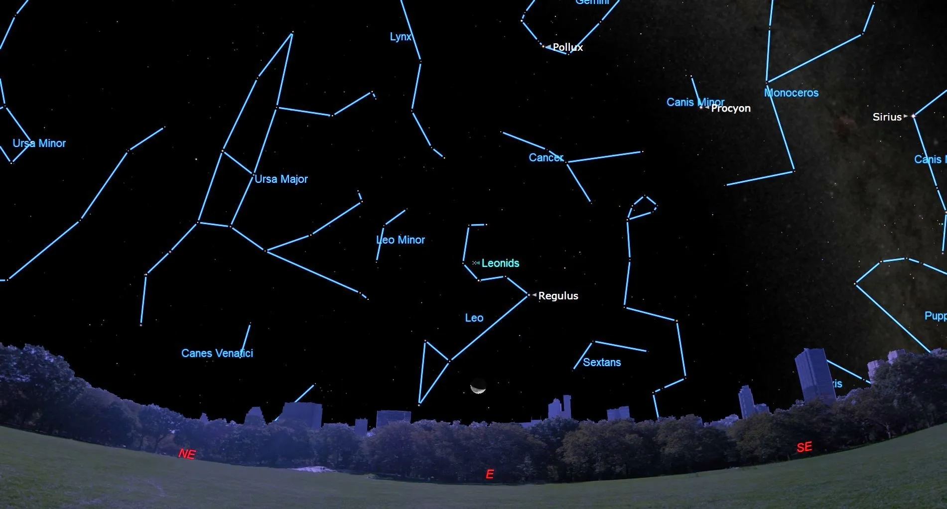 آسمان شبهای پایانی آبان 1401 و محل کانون بارش شهابی اسدی که در طرح داس-مانند صورت فلکی شیر دیده میشود.