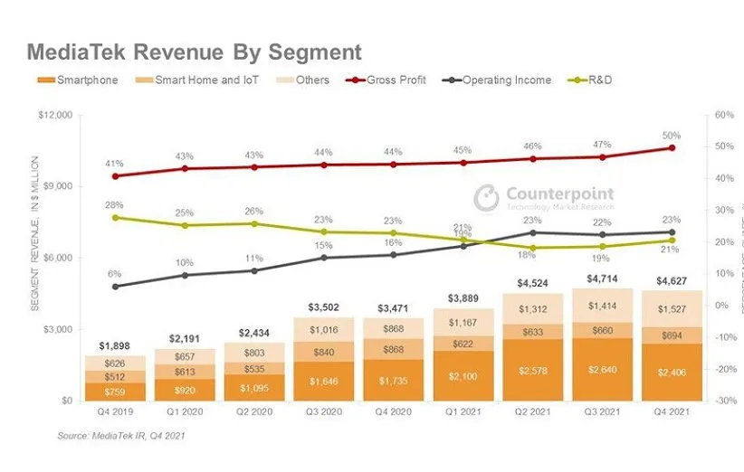 شرکت مدیاتک در سال 2021 با ارتقای عملکرد خود در بازار تراشهی گوشیهای هوشمند، برای چهارمین سال متوالی به رکورد درآمد 17.6 میلیارد دلاری دست یافت که این مبلغ ناشی از سرمایهگذاری در فناوری اینترنت همراه نسل پنجم (5G)، وای فای 6 و فناوریهای کم مصرف بوده است. همچنین باید خاطر نشان کنیم که درآمد این شرکت در سال 2020 به 11.5 میلیارد دلار رسید که از درآمد سال گذشتهی آن 53 درصد بیشتر است. با این حال درآمد مدیاتک در سه ماههی چهارم سال 2021 2 درصد کاهش یافته که عمدتاً به دلیل کاهش 9 درصدی نسبت به سه ماههی قبلی در فروش گوشیهای هوشمند بوده است.
