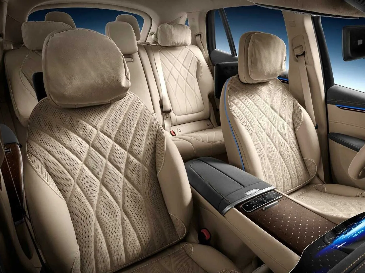 در کابین داخلی از چوب و چرم برای ایجاد فضایی سالن-مانند استفاده شده است. مرسدس به مشتریان اجازه میدهد تا فضای داخلی را در هفت ترکیب رنگ مختلف سفارشی کنند. همچنین صندلیهای ردیف سوم اختیاری و ردیف دوم با قابلیت تنظیم الکتریکی ارائه میشوند که به شاسیبلند EQS امکان میدهد تا هفت نفر را جابهجا کند.
