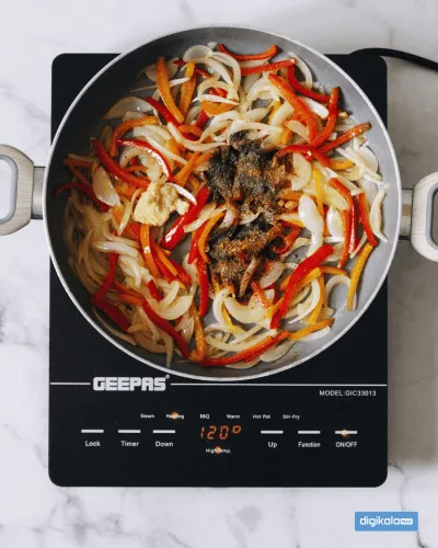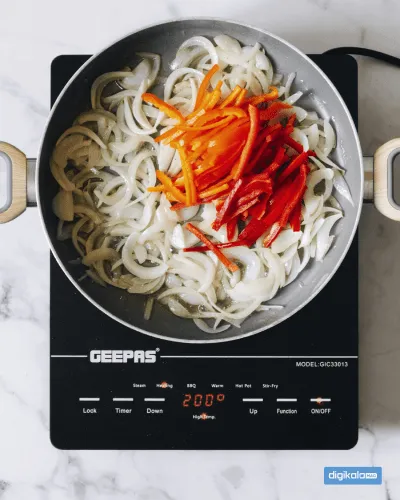 زمانی که پیاز کمی تفت خورد و سبک شد، فلفل دلمهای رنگی خلالی شده را به تابه اضافه کنید. برای بیشتر شدن عطر غذا میتوانید از فلفل دلمهای سبز هم استفاده کنید.