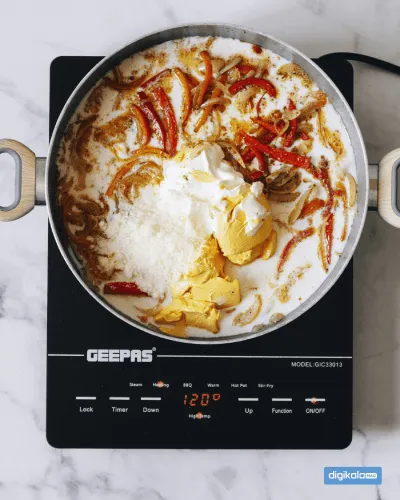 پس از ادویهها شیر را اضافه کنید و در تابه را برای مدت 30 دقیقه بگذارید تا فلفل و پیاز کمی پخته شوند. سپس پنیر دیپ چدار، پنیر خامهای و پنیر پارمزان را اضافه کنید.