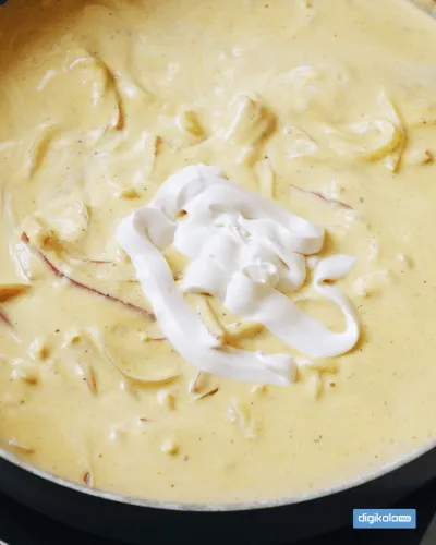 وقتی که سس غلظت پیدا کرد، خامهای را که هم دمای محیط شده است به آن اضافه کنید.