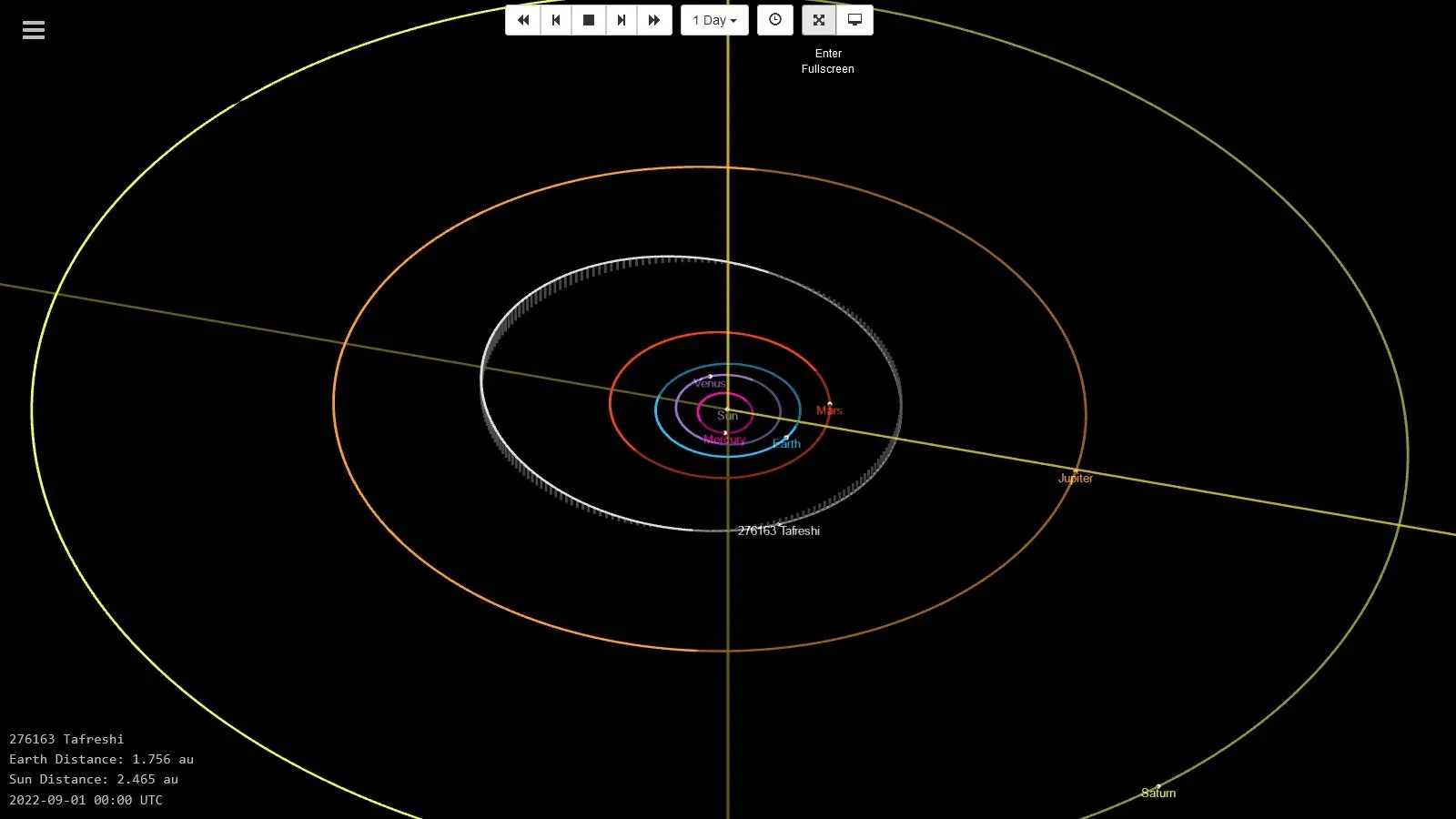 فاصلهی سیارک تفرشی از خورشید بین 2.3 تا 3.0 واحد نجومی متغیر است. واحد نجومی (AU) فاصلهی تقریبی زمین تا خورشید و برابر با 150 میلیون کیلومتر است. این سیارک در حال حاضر، در صورت فلکی کمان (قوس) در حال حرکت است و با توجه به موقعیت فعلی آن نسبت به خورشید و زمین، با تلسکوپهای متوسط با قطر 50 سانتیمتر و با استفاده از یک دوربین دارای CCD قابل رصد است.