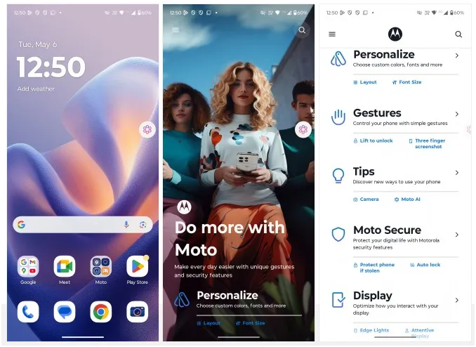 موتورولا اج 60 پرو با Hello UI مبتنی بر اندروید 15 عرضه میشود. رابط کاربریای که همیشه سبک، نزدیک به اندروید خام و بدون انیمیشنهای سنگین بوده، اما در این نسل یک تفاوت مهم دارد؛ حضور Moto AI. این مجموعه هوشمصنوعی قابلیتهایی مثل Catch Me Up برای خلاصهکردن اعلانها، Pay Attention برای تبدیل گفتوگوها به متن و خلاصهسازی، Next Move برای پیشنهادهای هوشمند و Remember This برای ذخیره اطلاعات با فرمان صوتی را ارائه میدهد. این ویژگیها بسیاری از کارهای روزمره را سادهتر و سریعتر میکنند.