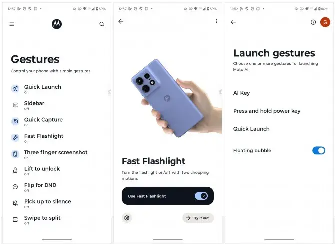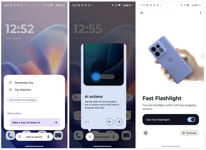 ویژگیهای متمرکز بر هوشمصنوعی همگی از طریق کلید اختصاصی AI در کنار فریم فعال میشوند. کلیدی که با یکبار فشردن ابزارهایی مثل Update Me و Take Notes را فراخوانی میکند و با نگهداشتن طولانی، Moto AI بدون نیاز به بازکردن قفل فعال میشود.