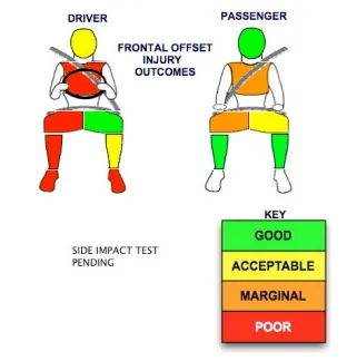آن طرف، وضعیت ایمنی شاگرد بسیار بهتر از راننده است؛ سر و ساق پاها در وضعیت سبز و ایمن قرار دارند. قفسهی سینه و ران پای راست در وضعیت نارنجی (متوسط رو به پایین) و ران پای چپ در وضعیت قابل قبول قرار دارد. خودروی مورد تست به 2 کیسهی هوای جلو مجهز بود. از سیستمهای ایمنی استاندارد این خودرو میتوان به ترمزهای ضد قفل ABS و توزیع الکترونیکی نیروی ترمز (EBD) اشاره کرد.